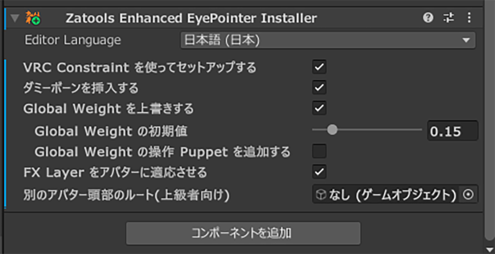 アバターに追加した「EyePointer」を選択し、「コンポーネントを追加」から「Zatools Enhanced EyePointer Installer」を追加します。